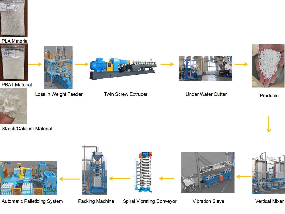 Starch filled bio-plastic compounding line is composed of four parts. They are dosing system、compounding system、underwater cutting system、downstream auxiliary equipment.